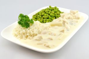 ![]() | DGE-zertifiziert HÜHNER- FRIKASSEE* Erbsen Reis Dessert: Pudding-Becher |