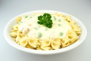 Käse-Sahnesauce mit Erbsen gemischter Blattsalat mit Joghurtdressing Dessert: Apfel (DGE) |