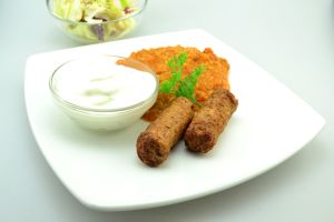 (Geflügel-Hackröllchen) Vollkorn-Quinoa mit Paprika, Zaziki Gurkensalat in Joghurtdressing Dessert: Apfel (DGE) |
