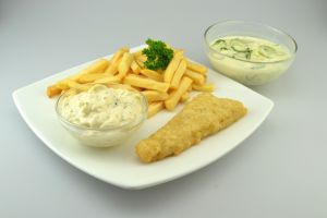 (paniert) mit Remouladensauce Pommes frites Gurkensalat in Joghurtdressing |