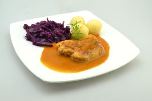 GESCHNETZELTES* in Rahmsauce Apfel-Rotkohl Salzkartoffeln Dessert: 2 Mini Schoko-Donuts |