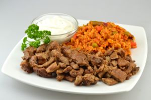 ![]() | DGE-zertifiziert HÄHNCHEN-GYROS* Vollkorn-Djuwetschreis (u.a. mit Möhren, Erbsen, Paprika) Zaziki Krautsalat Dessert: Clementine (DGE) |