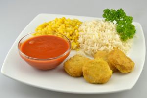 NUGGETS* (paniertes Hähnchenfleisch) Barbecuesauce Mais Reis Dessert: Clementine |